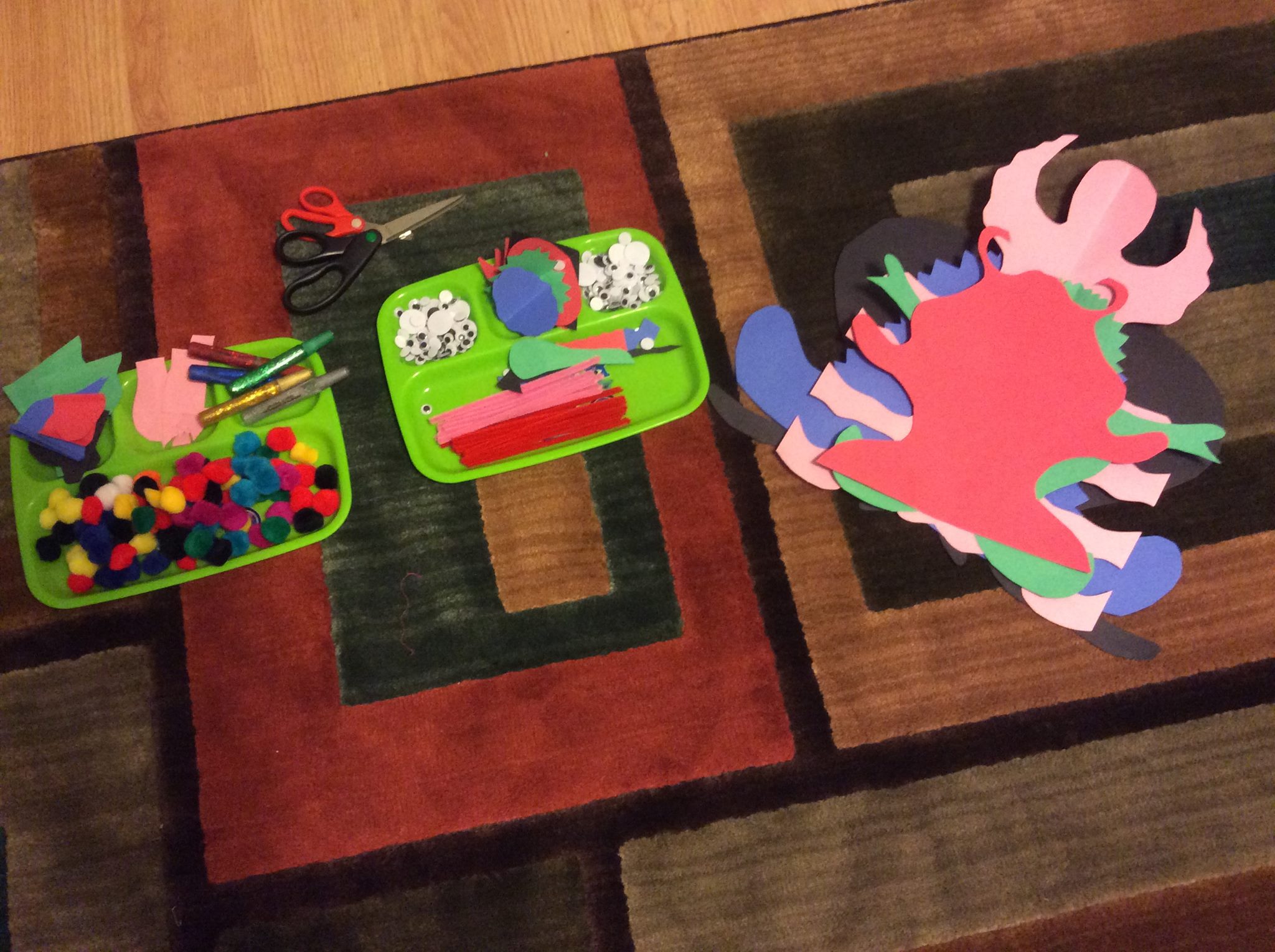 - Gather supplies: Construction paper, glue sticks, scissors, pipe cleaners, and googly eyes. We also use a lot of glitter glue.