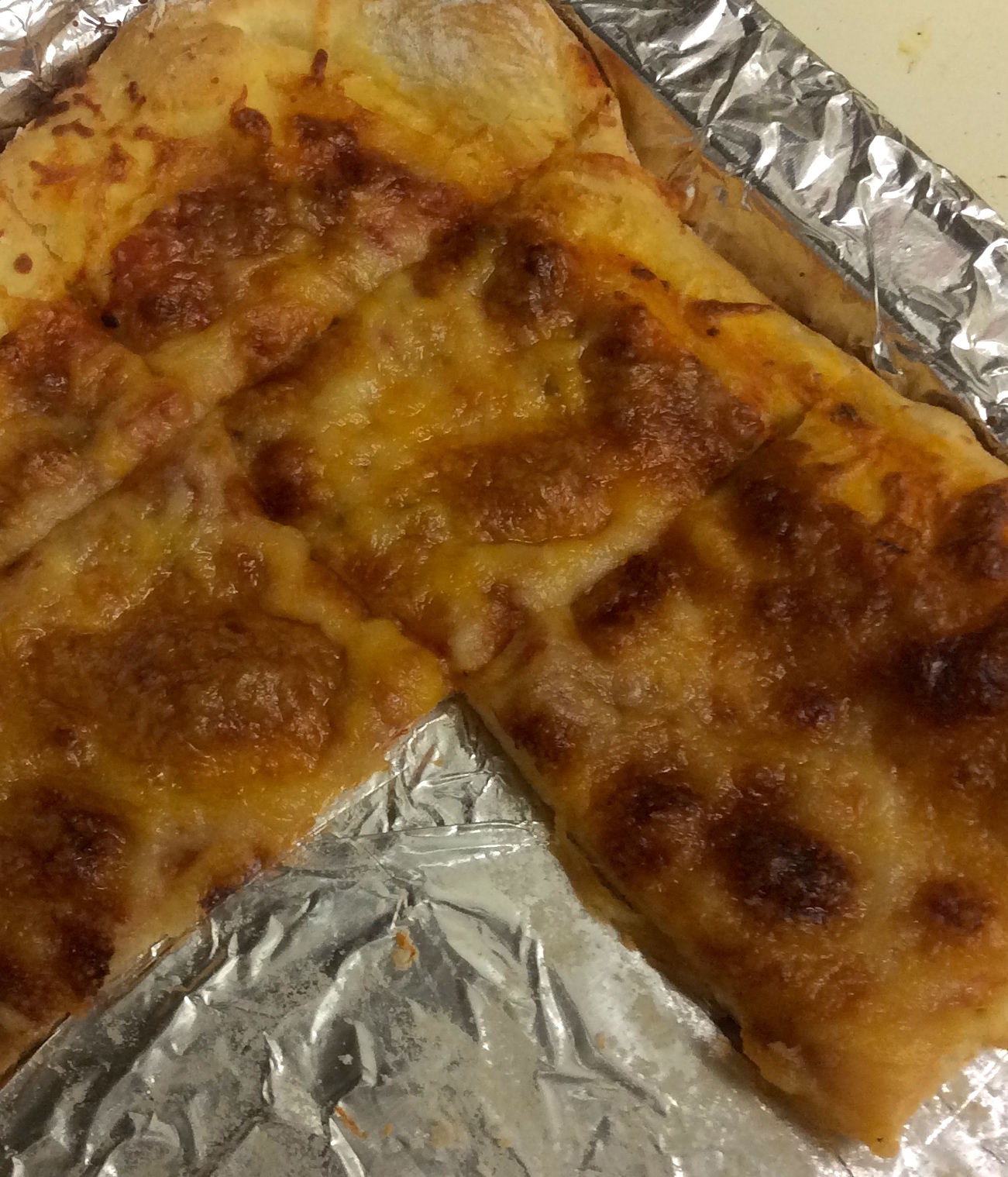 6. Slice and serve.  I usually get 3 or 4 servings per pizza. We like thin crust, so I roll the dough out to fill a cookie sheet.