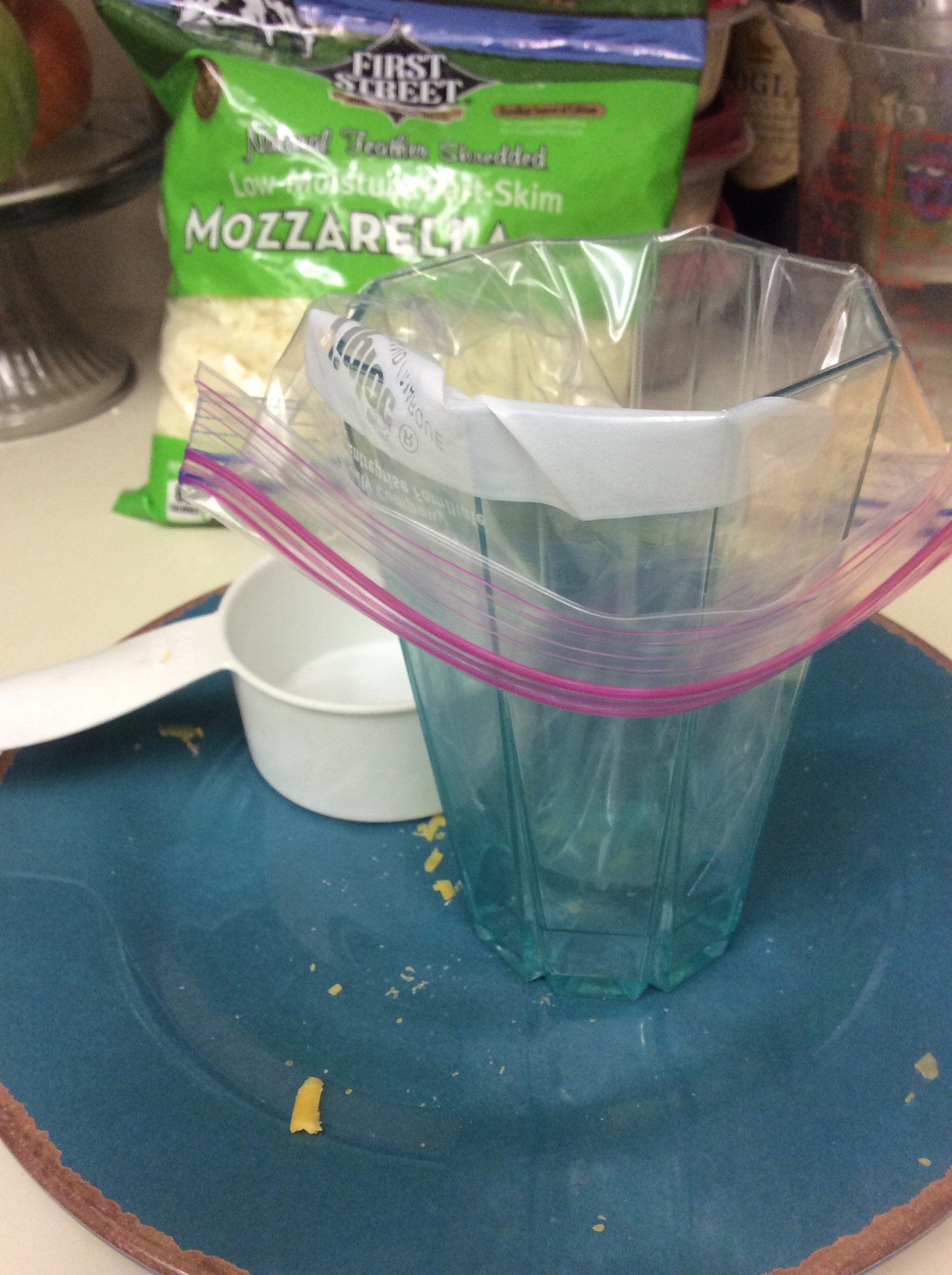 Put the bag into the cup and wrap the top of the bag (the part with the zip top) over the mouth of the cup. Using the measuring cup, measure however much cheese you plan to store per bag.