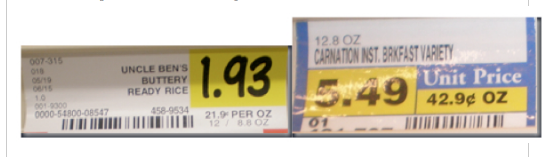 The 5 lb bag of cheddar cheese was $12.49, and it contained roughly 19 cups of cheese. That makes each cup of cheese .66, making each zip loc bag of cheese containing 2 cups of cheese $1.32. That’s a savings of $1.27 per bag over the pre-measured zip-top bag. When I’m not sure which is a better deal while I’m in the store, I check the price per ounce on the shelf label. Here are two examples of a shelf tag that shows the price per ounce for two separate products (Uncle Ben’s Rice and Carnation Instant Breakfast).