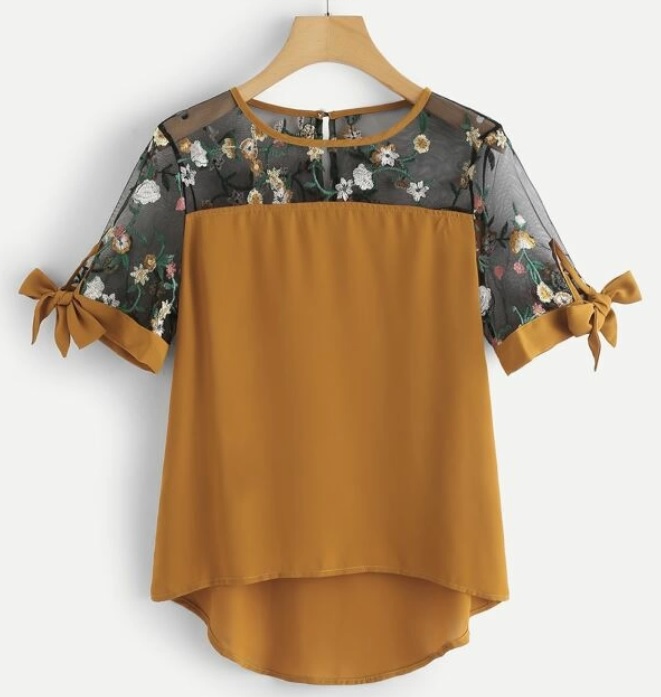 This shirt is the one I found at the clothing swap, Plus Floral Embroidered Mesh Tie Cuff Blouse. As of the time this post is being written, this shirt is $13.00. There are usually coupons or deals available on Shein, so you may be able to find the price lower.
