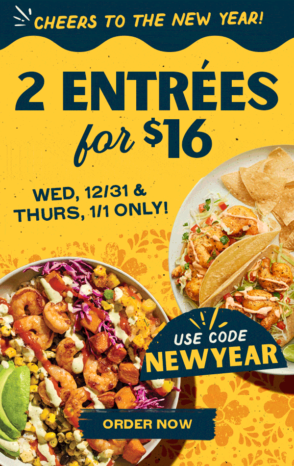 On 12/31 and 1/1/2025, use code NEWYEAR to receive two entrees for $16. There are a lot of great choices, and with a few extra sides, or even some chips and guac, this could be a meal for 4!