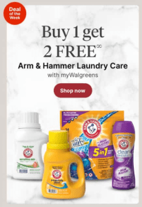 Laundry Supplies: My favorite laundry soap is Arm and Hammer. I try to stock up when Walgreens has Buy one, get two free sales about once a quarter. If you have a favorite laundry soap or product, check Target, CVS, or Walgreens. They frequently have sales and deals for laundry products.
