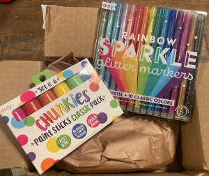 Recently our friends over at Ooly sent us a little box full of creativity. The kids and I love to do art, make stuff, and express our creative sides. I was stoked to receive the Rainbow Sparkle Glitter Markers, and Chunkies Paint Sticks.