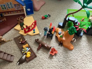 The animals and their people have all sorts of adventures. They have run a food truck, run a zoo, been on a cruise, gone on safari, hunted for wild animals, opened an iron and gold mine, run an orphanage (we have a lot of little kid Playmobil people), gone to college, gone to preschool, and taken a road trip to the “ocean” in Ohio. We paused the game for a bit to look at the US map to discover there is no ocean in Ohio, but they could go to Lake Erie instead. It was deemed the “Lake Erie ocean beach” adventure.